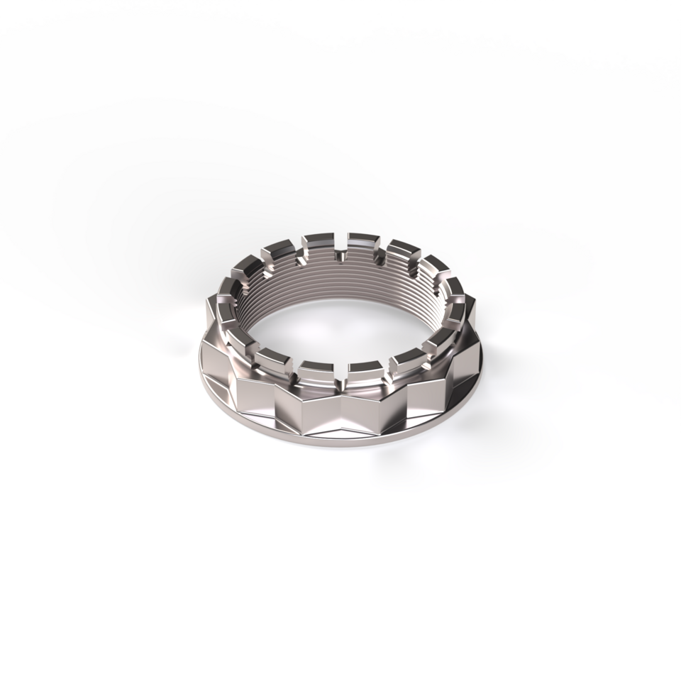 Die Mutter wird separat vom Zentrierkegel gefertigt, um eine Unterlegscheibe aufzunehmen. Dies sorgt für eine gleichmäßige Lastverteilung, schützt die Oberflächen vor Beschädigung und Verschleiß und verhindert ein Lösen, insbesondere bei Vibrationen.