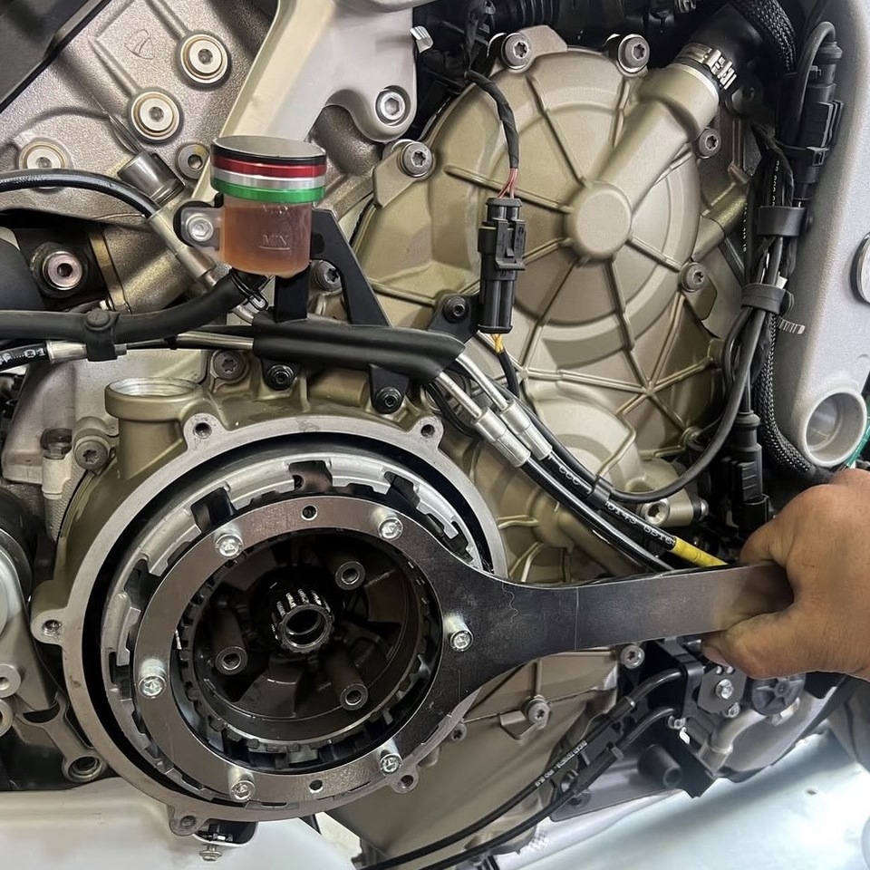 Clutch holding tool for the disassembly and assembly of the clutch by locking the inner shaft and the outer basket, enabling the retaining nut to be removed or tighten without damage to the parts.