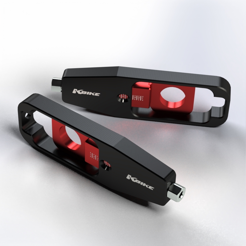 The chain tensioners are attached to the swingarm so they do not fall out and remain in place during wheel changes.